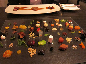 棕色的黄油伴随着冰刀鱼片变成粉末。尽管有些菜肴(从一口到四口大小)也许看似工艺复杂,但这些琳琅满目的或大气粗犷或精致细腻的口味又确实没有什么巧妙手法在其中。置身于这无窗的双层错落餐厅,加上静默的陈设和半自助式无干扰服务,你会感觉时光如白驹过隙。