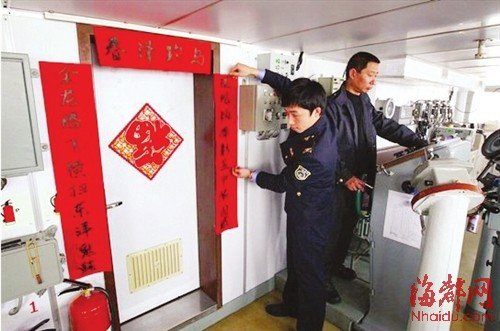 除夕夜,中国海监船编队在钓鱼岛海域进行常态化巡航。海监137船上,大红的中国结、喜庆的春联、团圆的红灯笼、多彩的蛇年吉祥物,早已经将全船上下装饰得喜气洋洋。