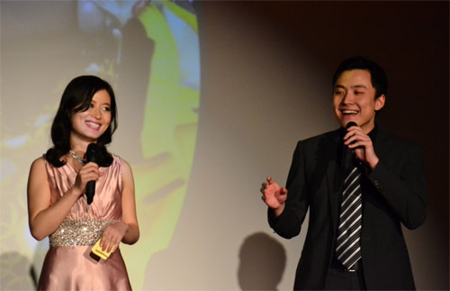 总领事馆教育组陈维嘉参赞(左),西北大学主管学生事务的副校长Patricia Telles-Irvin 在晚会开场之际致辞