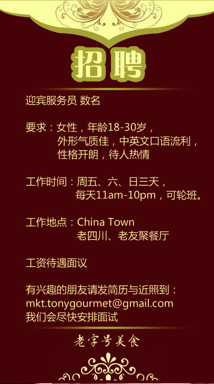 晓军美食集团招聘迎宾服务员!芝加哥Chinatown 老四川,老友聚上班。
