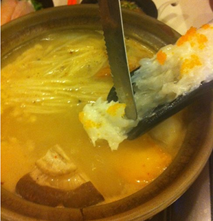 先说说他的小火锅吧,汤底味浓,小砂锅盛放,用小火炉加热。