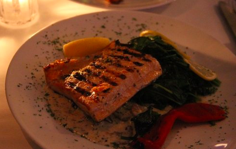 烤三文鱼,搭配蘑菇奶酱,菠菜和熟红椒。