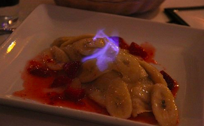 PANQUEQUE A LA FLAMA, 有趣的甜点:大块面皮包的桃酱,盖上香蕉片,