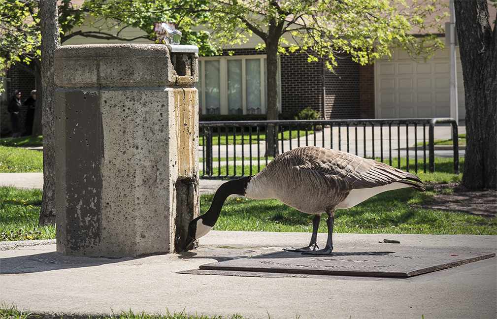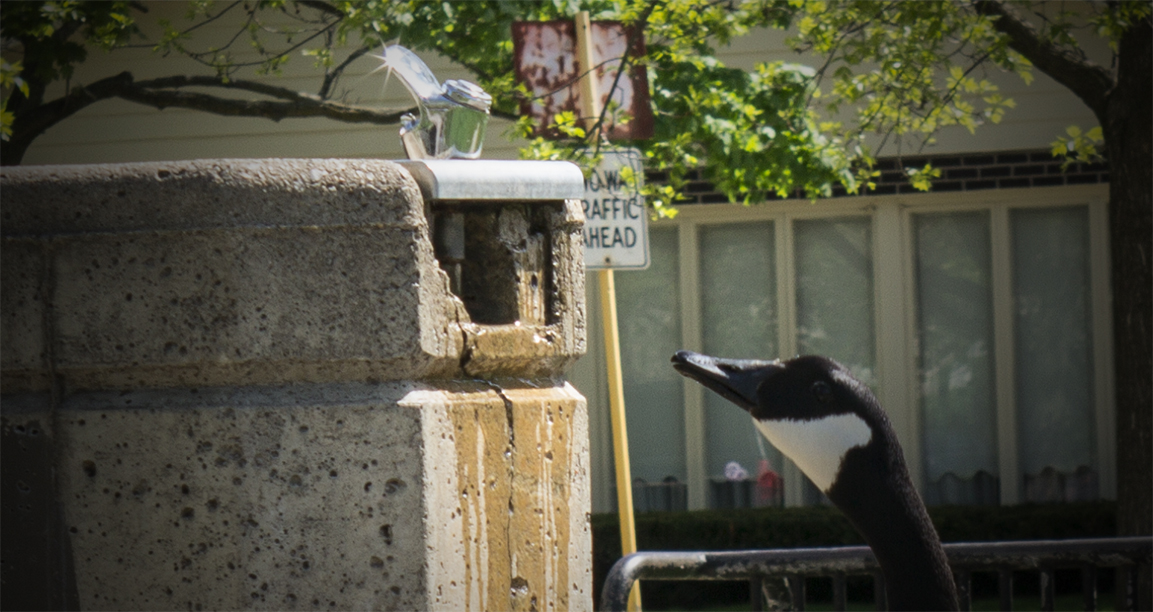 牠在公園裏飲水機前想喝水,無奈不能像人類用手去按制,只好低下頭去喝從低部流出的水。