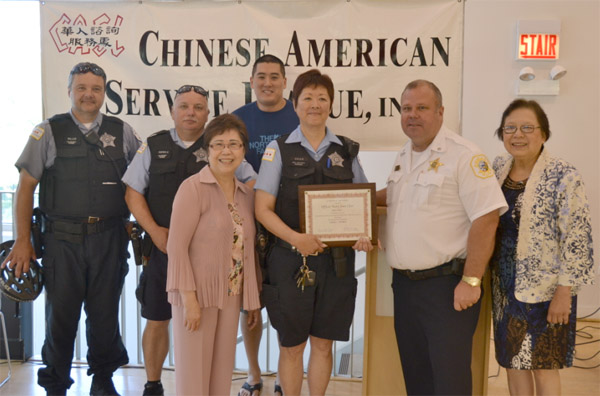 【芝加哥侨学网报道】从警十八年,服务南华埠社区十年的华裔警官陈黄于瑛,将于7月12日光荣退休。华人咨询服务处10日特别举办颁奖仪式,向陈黄玉瑛警官颁赠“社区瑰玉,华埠精英”奖牌,表达华裔社区对陈警官的感谢与惜别之情。