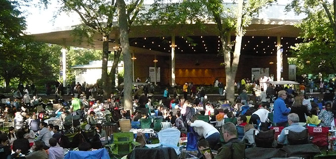 虽然在7月本该是酷暑的时节,当日芝加哥气温骤降,而在场听众的气氛却确异常澎湃。而作为拉维尼亚音乐节的一个公益性特点,敞开式音乐厅内的票价仅为$25,更多希望感受大师之作的观众只需$10便可入场自备租赁便携桌椅,可自备食物等,在草地上,与亲友一起,在大师们精湛的演奏技艺及触动心灵的每个音符中,同享芝加哥郊外傍晚的星光与清凉。