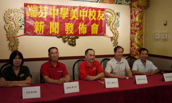 美中台山端芬中学校友会举办排球赛新闻发布会,左三为梅兆立会长