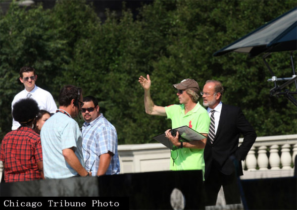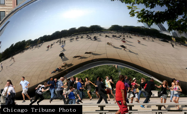 剧组在芝加哥千禧公园“大豆子”雕塑前拍摄电影场景