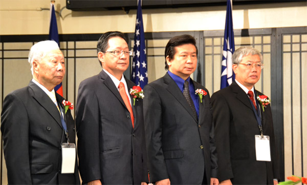 出席全美各地中华会馆、中华公所联谊会第三十届年会,左起:芝加哥著名老侨领伍健生、台湾驻美公使李澄然、台湾陆委会副主任张显耀、侨务委员长陈士魁
