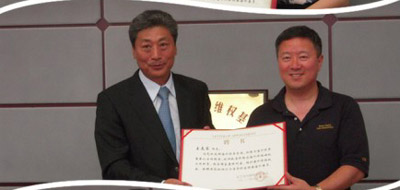 辽宁省侨联主席王之锋(左)向王志东律师(右)颁发辽宁省侨联法顾委委员聘书