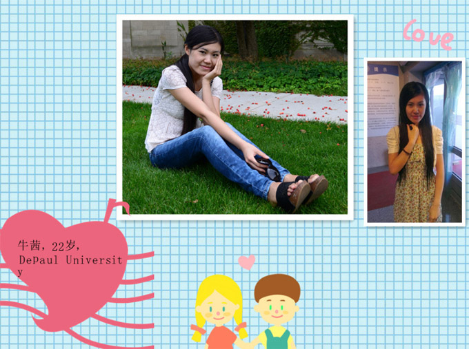 牛茜, 22岁,研究生 兴趣爱好:喜欢旅游、摄影、看电影。爱干净,爱热闹,爱刺激。害怕一切动物。 没方向感,记不住路;笑点极高,哭点极低。