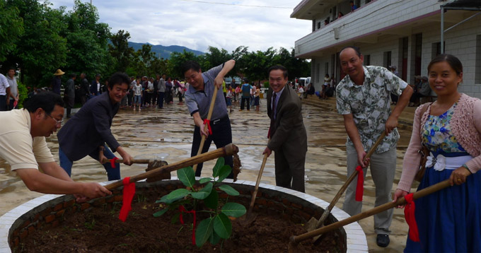 芝加哥明光教育基金会会长张文卿博士,再度于今年八月间远赴云南程海镇毛家湾,为贫困山区兴办的“明光白梅小学“主持开幕启用典礼;并与程海镇党委书记陈德斌、校长梁宇、副校长聂菊、云南丽江外事局主任和为剑等在校园裡栽种了一棵纪念树,象徵着百年树木、十年树人的深厚渊源的意义。