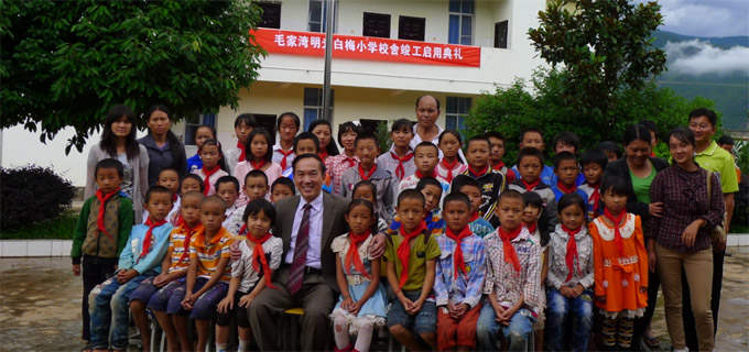 毛家湾的“明光白梅小学“,是明光教育基金会于2004年,得到芝加哥侨社各界的热心支持、知名歌唱家白梅的热情演出,筹到了部分兴建学校的款项;但一直无法找到配套的地区与校舍,直到2007年在云南程海镇,找到了建于1951年、原名”毛家湾小学”,佔地3963平方米,有校舍25间的破旧校舍,并在政府的关怀下,教育局的配套14万人民币,地方捐资6万,明光教育基金会捐赠人民币15万,终于排除万难的兴建了一所崭新、安全的水泥钢筋校舍让数百位师生使用。