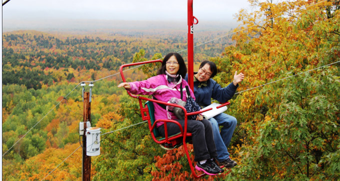 幸而次日天气开始转好,我们竟然在回程之前,在最后一次寻秋路上,来了一次意想不到的惊喜。就在那滑雪的铜峰山上,竟然可以看到360度的四周,放眼至与天边接壤的最远处,均是层林重迭,漫山红遍的无限秋色。震撼啊!其惊艳处竟比以往在凯韦诺(Keweenaw)半岛所看到的还胜一筹。而太阳在此刻亦开始出来了,但我们已在此间留恋太久,不得不向北密説声再见。而我们再次回到芝城华埠时,都已夜幕低垂,行人稀疏了。