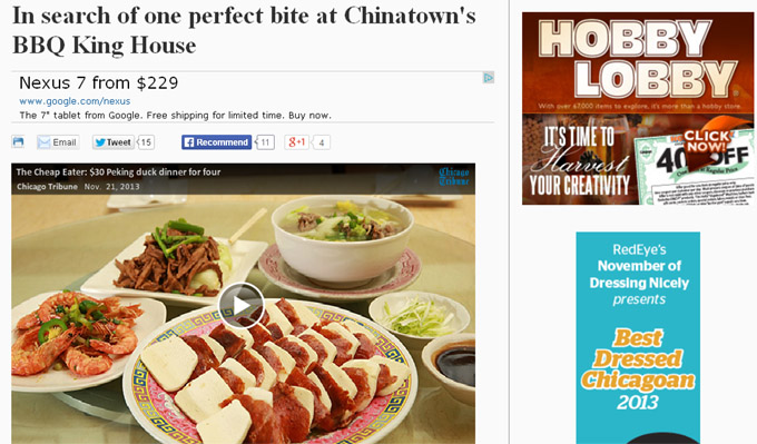 11月21日 Chicago Tribune 美食专版,全版介绍皇上皇烧腊店(BBQ King House)的数十年经典菜: