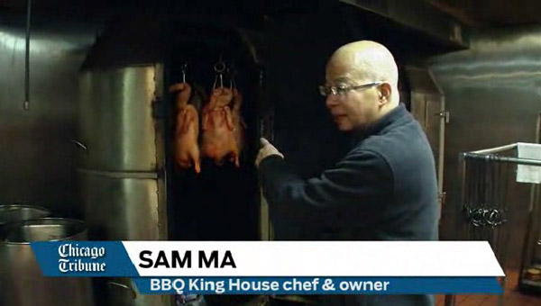 Chicago Tribune 介绍皇上皇的视频片段:老板马森柱在介绍明火炭烤烤鸭炉