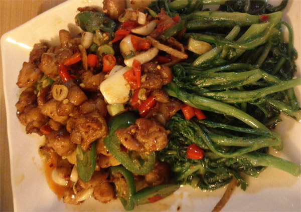 小煎鸡,浓香鲜味都渗透到下面的青菜了,赞一个。