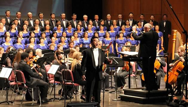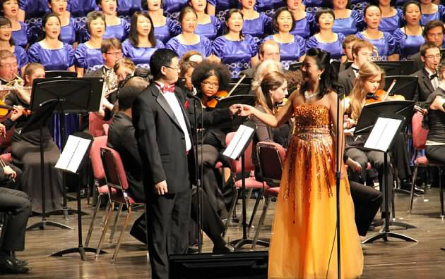 男中音歌唱家岳彩轮、女高音歌唱家陈旻也给大家带去了他们的拿手作品,俩人还合作了一曲音乐剧“歌剧魅影”中的唱段“我唯一的恳求”,声情并茂的表演给观众留下了深刻的印象;上半场的压轴是由圣路易交响乐团第一小提琴手、华裔女青年强箫箫演奏的小提琴协奏曲《梁祝》,那凄婉动听的旋律在音乐厅回荡,给人一种无可比喻的艺术享受。