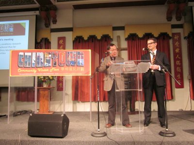 华埠更好团结联盟主席陈增华(左)和芝加哥大都会规划局史提芬欧斯崔德(右),在9日的社区大会中介绍华埠远见计画第一阶段现况研究及民意调查结果