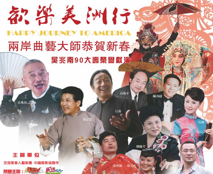 本次《欢乐美洲行》明星阵容包括,现年90高龄的吴兆南,台湾著名相声大师,被誉为台湾的“侯宝林”。 刘兰芳,中国国内最著名的评书大师(中国曲艺协会名誉主席);快板表演艺术家张志宽及入室弟子张楠;国家一级演员口技手影艺术家张军旗与秦玉杰;多次出访世界各国的青年京剧艺术表演家郭玲玲、王钦;青年女魔术与变脸大师王彬等等。