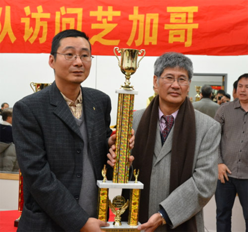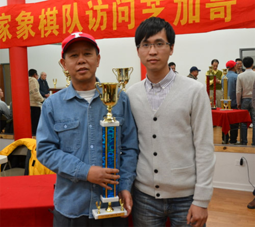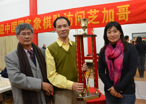 由芝加哥中国象棋总会主办的「2013年象棋公开赛」日前刚刚落幕,谭明章、邓慧东、梅辉分别荣获冠、亚、季军。在中国国家象棋队代表团访芝之际,特别由领队郭莉萍,象棋国手鑫鑫、汪洋,分别为本次象棋公开赛前三甲颁奖。