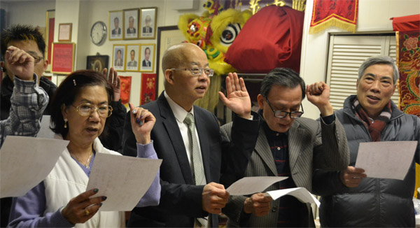 芝加哥侨学网报道】芝城洪门致公堂12月23日隆重举行2014 年度新职员就职典礼。洪门致公堂新任主席马森柱、谭建国,带领新届职员庄严宣誓,号召芝加哥洪门兄弟在新的一年中团结合作,发展洪门会务,为促进侨社和谐、社区繁,增进中美友谊荣再作贡献。