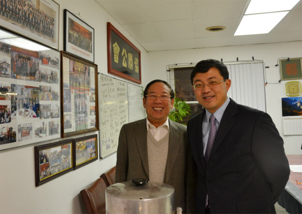 王永副总领事(右)在协胜职员黄国铭(左)的陪同下参观协胜图文资料展