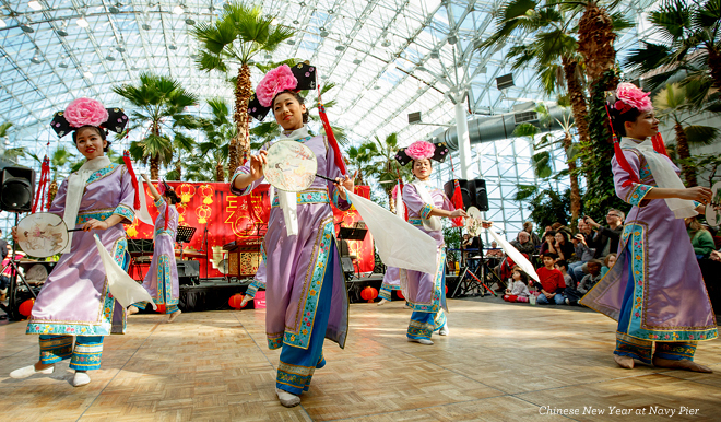 600 E. Grand Ave., Chicago, IL2月16日(中午12时至下午3时)海军码头还将推出元宵佳节庆祝活动,届时海军码头著名的水晶花园(Crystal Gardens)将有书法、剪纸艺术示范、灯笼制作等特色活动,中华才艺协会也将带来中国民俗歌舞表演,同时还将有体现中国文化特色的工艺品市场。