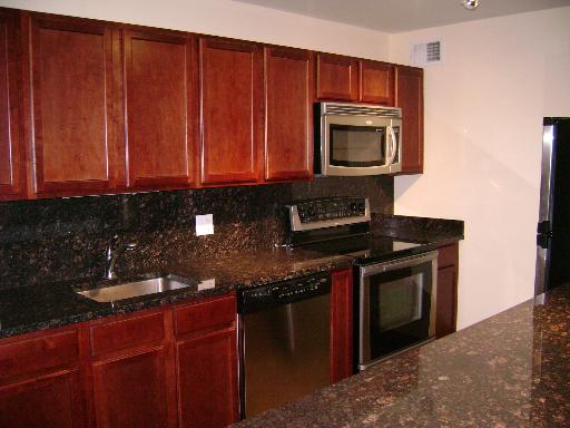 - Carpet in bedrooms and hardwood floors elsewhere; granite kitchen tops
