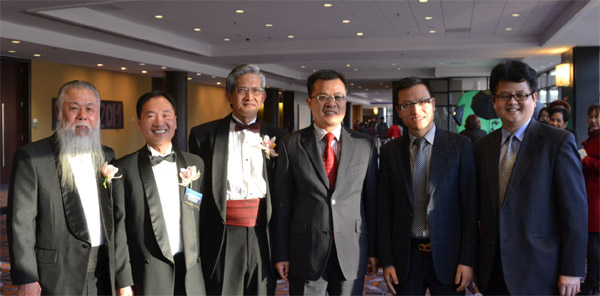 各界嘉宾在酒会上合影,左四为中国驻芝加哥总领事馆赵卫平总领事