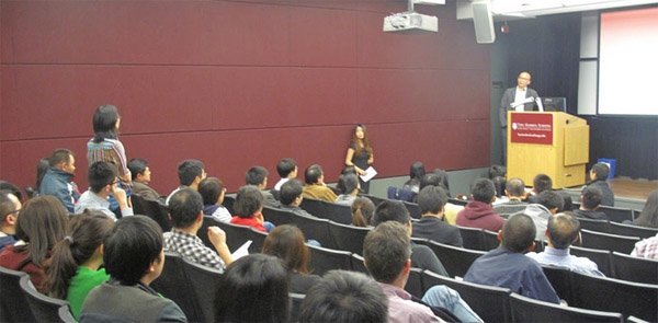 清华09级校友韩梦莹是本次活动的主持人,在做了简短的开场介绍之后,就进入了袁岳博士的对中国经济与创业环境的演讲。袁博士的演讲深入浅出,把中国当前的经济形势与各种创业的热点进行了独到的点评。在长达进两小时到演讲过程中,不时被现场观众的笑声与掌声所打断。在最后的观众互动的环节中,大家更是踊跃发言,各抒己见,在进行了比预定时间延长半个小时后还方兴未艾。
