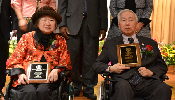 为芝加哥同源会复会、推动会务发展贡献杰出的侨领黄显扬(中)颁奖