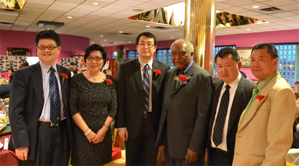 丹尼戴维斯议员与中国驻芝加哥总领事馆张庆新领事(左三)、宋爱华领事(左二),左一为和统会会长李红卫,右一为协胜公会主席陈羡韶