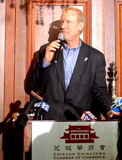 伊州州長共和党派候選人朗尼( Bruce Rauner),5月22日應芝城華商會之邀,在老友聚餐厅舉行的午餐會上发表演讲,阐述他的竞选纲领:“ 伊州的未來 : 小型企業/就業/教育/任期限制 ”( The Future of Illinois : Small Business/Jobs/Schools/Term Limits) 。朗尼幽默地表示,在决定向竞选之前曾和家人一起商討,结果他13歲女兒不希望他做伊州的州長,原因是不希望見到他“進监狱”。朗尼表示,伊州多年來政壇的貪污腐敗,已經成為全球的笑料,連一個13歲的孩子都這樣認為,因此,更加深他要振奮伊州政壇的決心,讓伊州的大、中、小企業有生機、人民安居樂業、孩子們都在優秀的學校環境中學習。