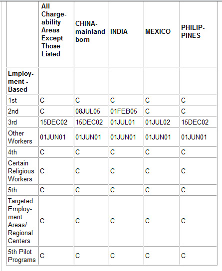 一类绿卡(特殊人才)全部Current,二类绿卡(硕士)排期为2005年7月8日,仍在原地踏步;三类绿卡排期仍为2002年12月15,原地踏步。 “Current”的意思:如果你的140申请表已批下来,你的排期变为Current之后,就可以立即递交485申请表格。注意:移民局的工作类绿卡排期,完全没有规律可循,甚至还出现排期倒退的情况。