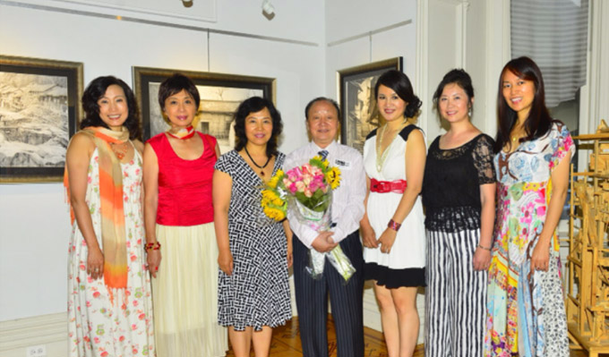 陈钧家人. 左,华联会副会长,栾文琦,左二陈梅女士9画展筹备人,左三陈梅女士母亲, 左四,五,陈钧先生,左七八,芝加哥亲属