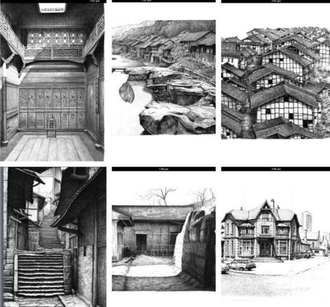 陈钧先生本次参展作品共有11幅钢笔画和马克笔画,钢笔画有: 四川笋溪河畔,安徽木雕楼,大连广场的俄罗斯建筑, 四川福宝镇街景, 四川福宝镇远眺。 马克笔画有: 胡杨树, 香港湾仔街景, 南方水乡,秋季的亚当斯河,纽约街头。