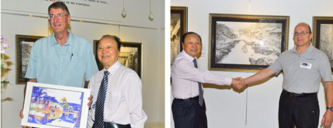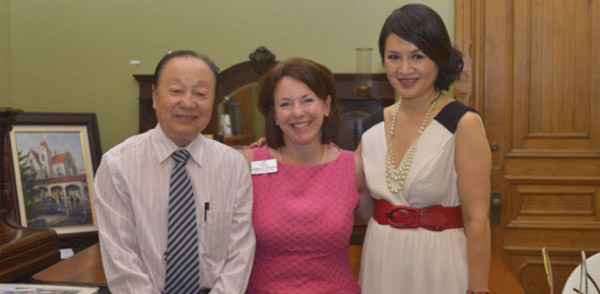 画家陈钧(左)与当地展馆主任 Siobhan Cottone (中),画展主办人陈梅(右)合影留念