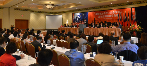台湾驻美代表沈吕巡、侨务副委员长吕元荣,均在演讲中一再强调台湾加入“跨太平洋伙伴协定”的必要性和重要性。吕元荣指出,对外贸易占台湾GDP的比例超过70%, 这决定了台湾一定要对外发展,融合亚太区域经济整合的版块中,否则台湾将被边缘化。