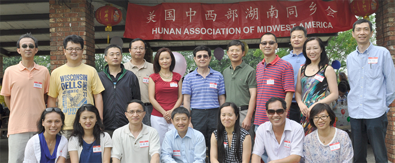 中国湖南同乡会理事会成员与嘉宾合影。上排右四王柏青会长,右五领事岑建德,右六华联会主席汪兴无,右七前会长肖小林,左三领事孙刚,左二芝加哥和统会会长李红卫,前排左三瑞华中文学校理事长张胜忠