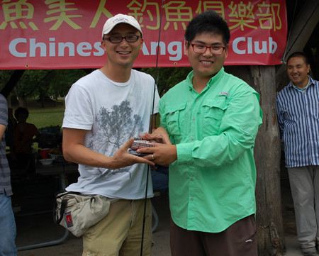 酒足饭饱之后,进入到颁奖环节。首先为今年三月底在Bassmaster钓鲈大赛大学组比赛中获得不俗成绩的韩宇、陈秋润颁奖,这是该赛事自1967年开赛以来,第一次有中国人参加。参赛的两位留学生都来自伊利诺伊大学香槟分校,其中韩宇同学更是鱼美人钓鱼俱乐部版主。在随后的专访中,他表示自己喜欢钓鱼不是为了“收获”,而是“探索”,是不断寻找和解密不确定性和未知性的过程。每次钓上来的鱼他都会重新放生到水里。接下来是为2013年秋,俱乐部自己举行的钓皮皮大赛的获奖选手颁奖;随后大家为要结婚的两对渔友和喜得贵子的两位渔友表示了热烈祝贺。