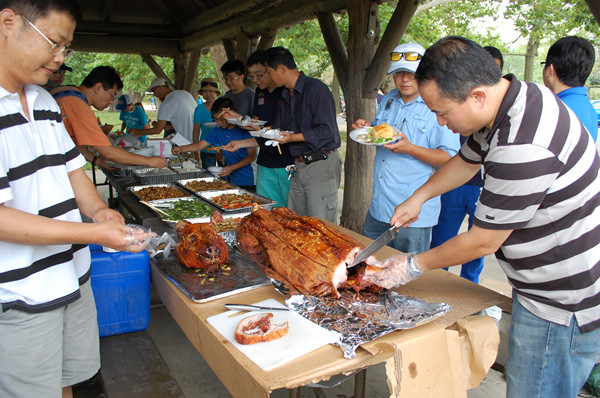 来自祖国的钓手和北京电视台节目组的朋友们,因为天天在野外录制“钓鱼王. 援美钓猎鲤行”节目,好久没有吃到像样的中餐,当天聚会现场丰盛的美食,芝加哥本地钓友们的热情与好客,终于让他们有了回家的感觉!