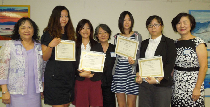 右起:會長李曼宜、獎學金得獎者陳琬婷、鄭艾令、評審薛悅馨、獎學金得獎者錢小小、林文淇、評審李香蘭