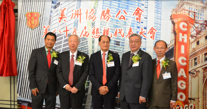 左起:芝城协胜公会主席陈羡韶,美洲协胜总理白杰熊、元老团主席伍焕鹏、总理谭炳垣,芝城协胜主席蔡锡锋为恳亲大会揭幕