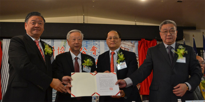 吕元荣(左一),代表陈士魁委员长致赠感谢状给美洲协胜公会,由总理白杰熊(左二)、元老团主席伍焕鹏(右二),总理谭炳垣(右一)代表接受
