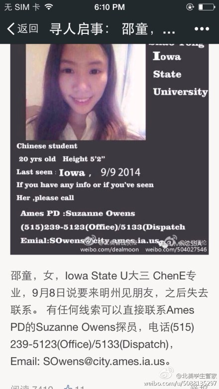 » 寻人启事:爱奥华州立大学留学生邵童自9月9日起失踪