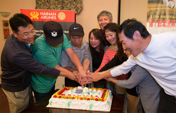 颁奖过后的抽奖环节更是高潮迭起,抽到奖品的球员兴高采烈,没有拿到奖品的球员也不时不失风度地调侃几句。主办单位不仅为大家准备了丰盛的晚餐,还特别订制了一个大蛋糕庆祝北京杯十周年,与大家分享成长的快乐。