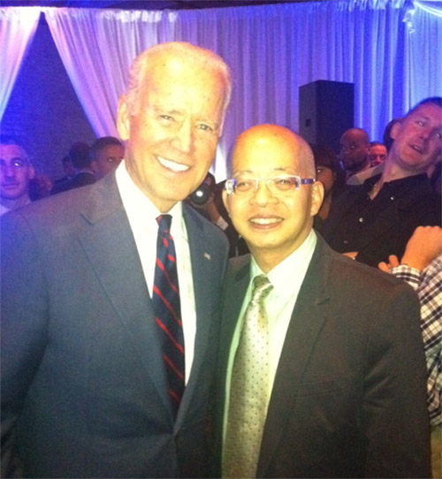 民主党民选代表马森柱(右)日前前往德州参加民主党全国委员会会议,并与美国副总统拜登(左)合影留念