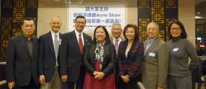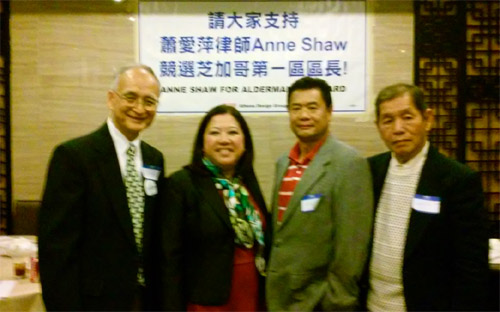 华裔律师萧爱萍(中)参选芝加哥第一区区长,获得华社同仁的大力支持,左一华埠更好团结联盟主席陈增华,左二为知名侨领黎斌雄