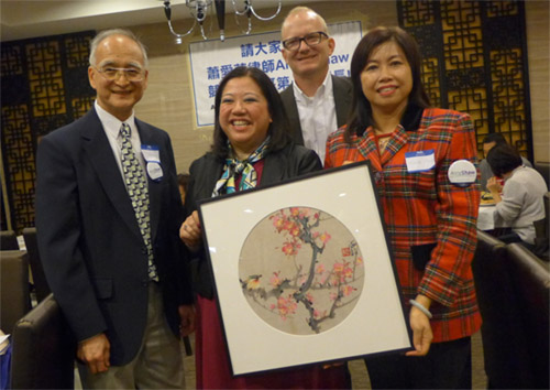 萧爱萍(前中)获得陈海韶赠画,由香港华协会会长郑品端(右)、董事黎斌雄(左)代表赠送。后为萧爱萍的夫婿马修麦伟尼